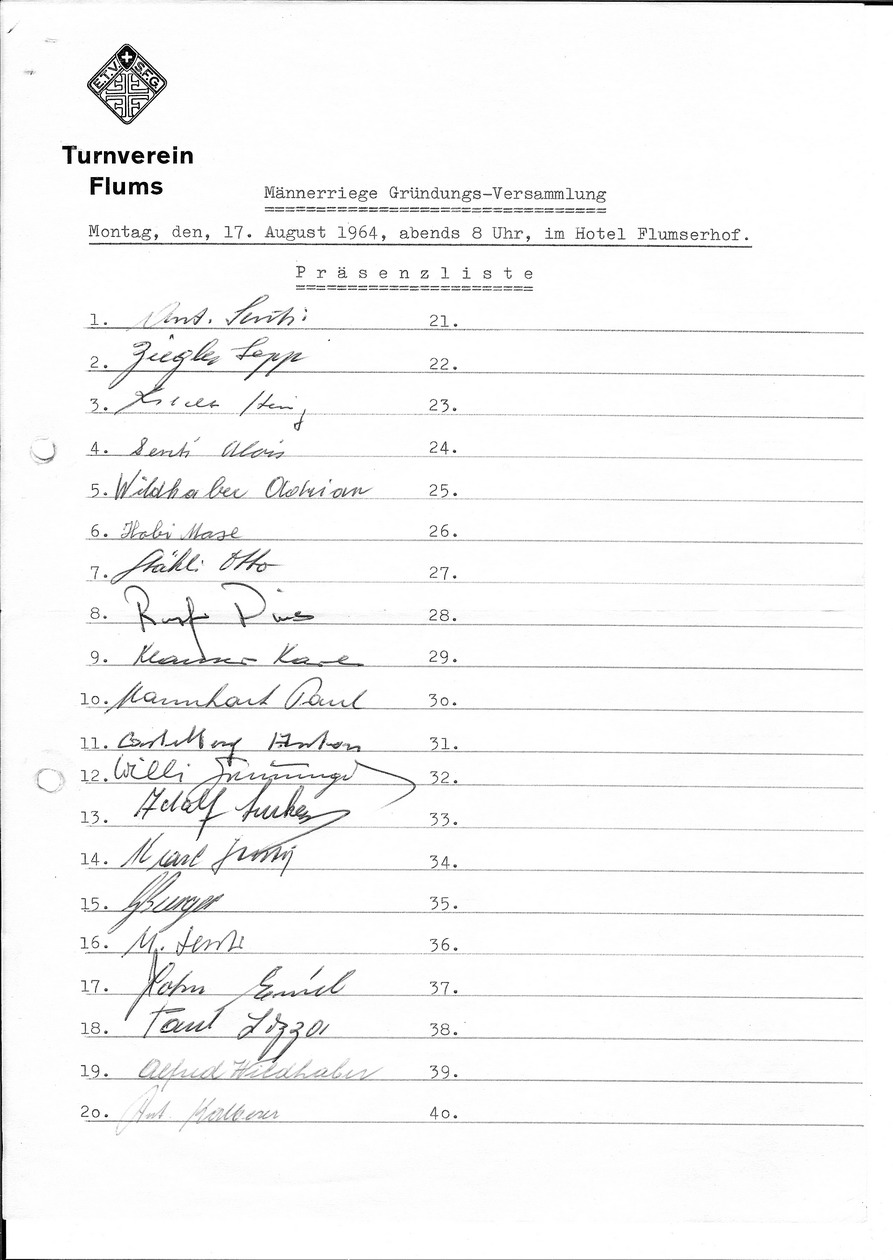Hervorgehend aus dem Turnverein, wurde am 17. August 1964 die jetzige Männerriege neu gegründet. Die Vorgängerin war etliche Jahre nicht mehr aktiv gewesen. 20 Männer fanden sich im damaligen Hotel Flumserhof ein und bestimmten an der Gründungsversammlung (siehe Präsenzliste ) folgenden Vorstand: Senti Anton Präsident, Kobelt Heinz Aktuar, Stähli Otto Kassier, Burger Georges Vorturner und Stoop August als Verbindungsmann zum Turnverein. An der 1. Hauptversammlung im Februar 1965 wird der Jahresbeitrag auf Fr. 8.- festgelegt und Statuten in Kraft gesetzt. Im nächsten Jahr wird zur wöchentlichen Turnstunde ein Jahresprogramm gestartet mit zwei sicheren (Skitouren) und vier Eventualanlässen. An einer nächsten HV wird die Turnstunde geregelt: 1 Stunde Turnen, eine halbe Stunde Spiel. Der Verein wächst pro Jahr um 1-2 Mitglieder. Die Turnfahrt wird auf 2 Tage ausgebaut und führt erstmals ins Safiental. Der Jahresbeitrag wird später auf Fr. 12.- angehoben. In einem andern Jahresprogramm steht: „Mittwoch, 6. Dezember: Fussmarsch nach Frohe Aussicht mit Klaushock“. Der Verein wächst und auch das Vereinvermögen steigt auf Fr. 1508.25. Wegen der Beiträge an den Kantonalturnverein muss der Jahresbeitrag erneut angehoben werden auf Fr. 15.-. Ein Preisjassen wird einige Jahre durchgeführt, das später der Fussballclub übernimmt. Die Mitgliederzahl steigt auf 38. Neue Statuten gibt sich der Verein 1991. Im Winter wird ein Lottospiel in den Flumserbergen bei Edy Bruggmann eingeführt. 1995 bildet der Verein die Seniorengruppe. Die anfänglich ihre Aufgaben und Ziele schriftlich festhält. Seit die Mehrzweckhalle in Betrieb ist, werden in derselben die Turnstunden gestaltet und bei Veranstaltungen anderer Vereine die Festwirtschaft geführt, was der Vereinskasse zugute kommt. Einige Turnfahrten wurden als Veloplausch gestaltet. Am Vita-Parcour wurde mitgearbeitet und Unterhaltsarbeiten stehen jedes Jahr an. An den Fasnachtsumzügen wird in loser Folge mitgemacht. Was mit dem Jahresbeitrag heute von Fr. 50.- den Mitgliedern angeboten wird, kann dem Jahresprogramm entnommen werden. Es lohnt sich, Mitglied der Männerriege Flums zu werden.